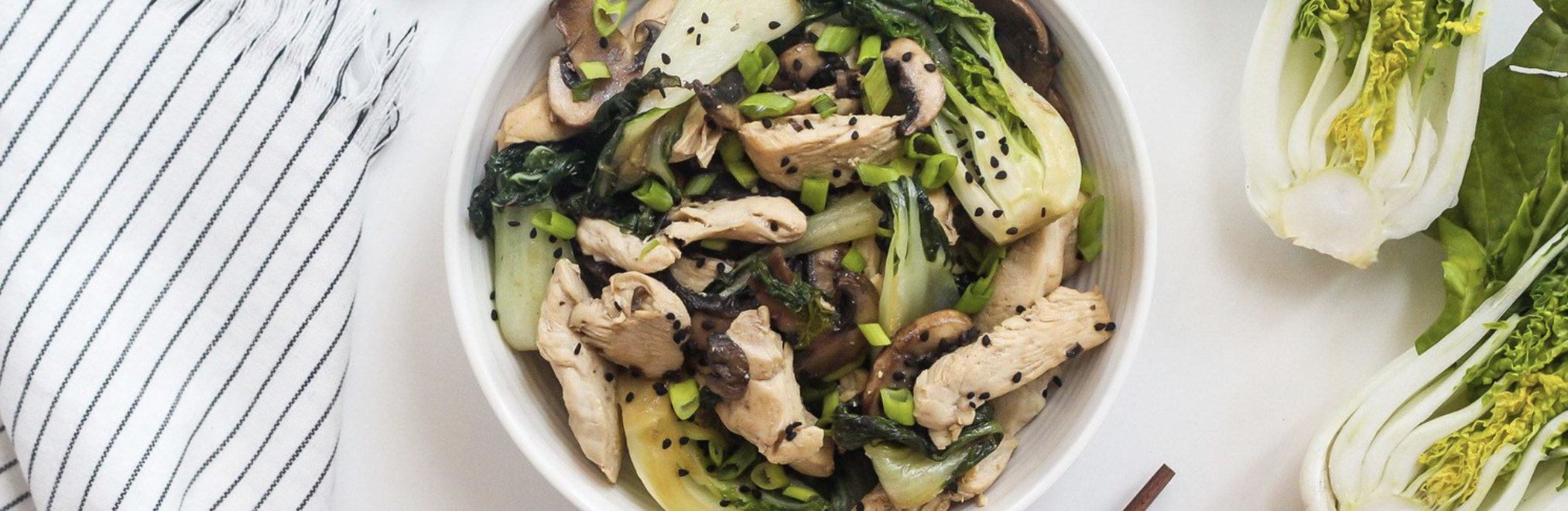 In the same skillet, add the minced garlic and sauté for 1 minute. Add the bok choy and cook for 1 minute. Add the mushrooms. Stir and cook for 4 to 5 minutes until everything is cooked. Add the coconut aminos and return the chicken to the pan. Add the sesame oil and stir to incorporate.