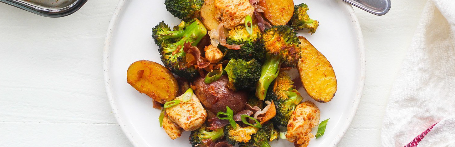 Remove the potatoes from the oven and add the chicken/broccoli mix on top along with the prosciutto. Place back into the oven and bake for 12 to 14 minutes, or until the chicken is cooked through. Remove from the oven, top with sliced green onion, serve and enjoy!